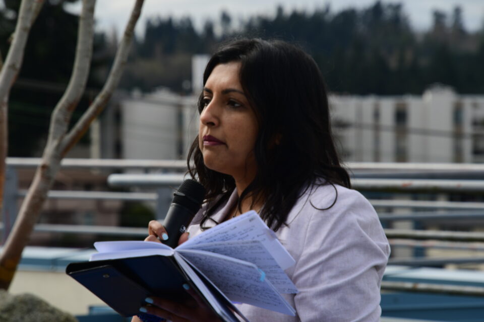 During a campaign kickoff event March 21, 2026 on the Edmonds Library patio, 32nd District candidate Jenna Nand speaks to supporters. (Photos by Larry Vogel)