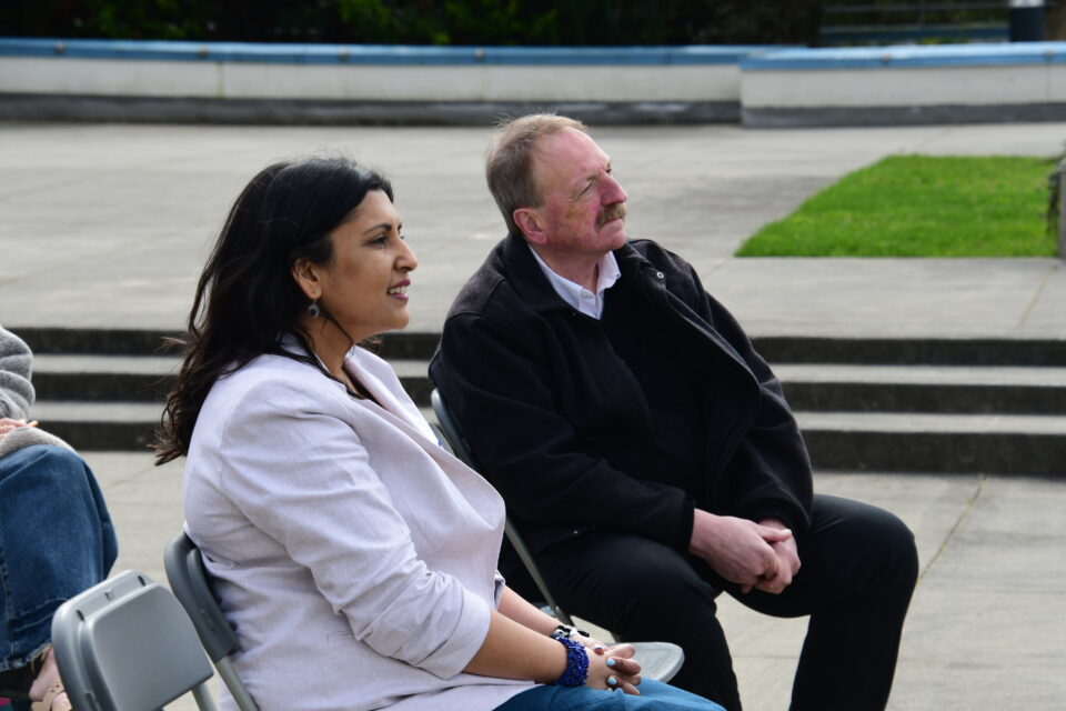 Jenna Nand and Dave Somers listen to speakers at the event