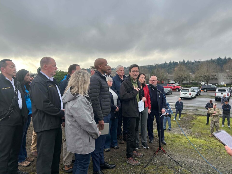 Gov. Bob Ferguson, at microphone, speaks during a press conference about the state’s flood response on Dec. 12, 2025, in Tukwila. (Photo by Jake Goldstein-Street, Washington State Standard)