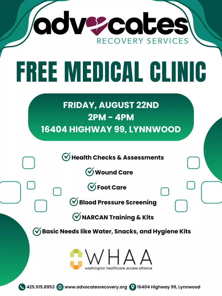 Advocates Recovery Services is hosting a free medical clinic in Lynnwood, offering checkups, wound care, narcan training and basic health services to all who need it, whether you’re uninsured, experiencing homelessness or seeking affordable health care.
