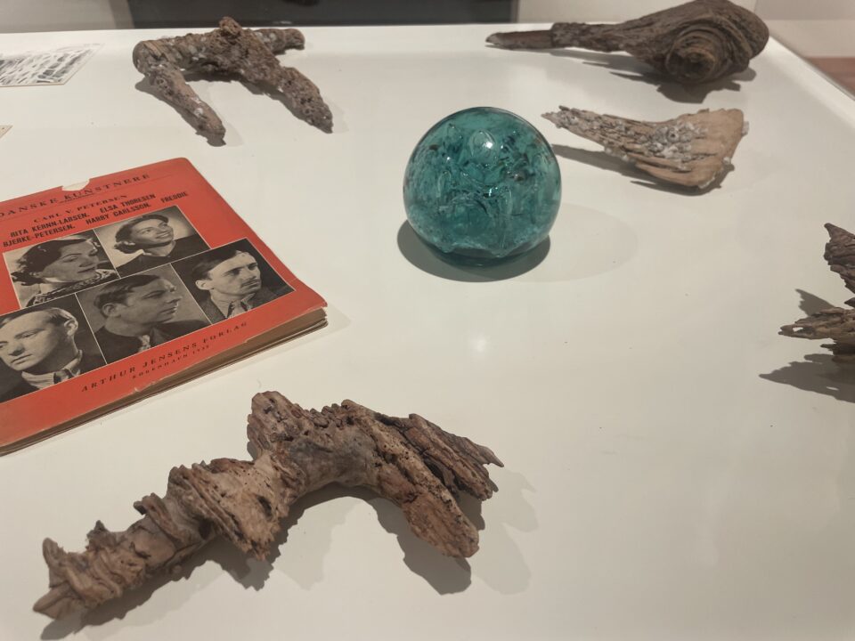 A glass case displays several of these driftwood pieces alongside a blue-green glass orb. The driftwood’s stippled surfaces and curves remain intact, and their elongated forms reappear throughout her work.
