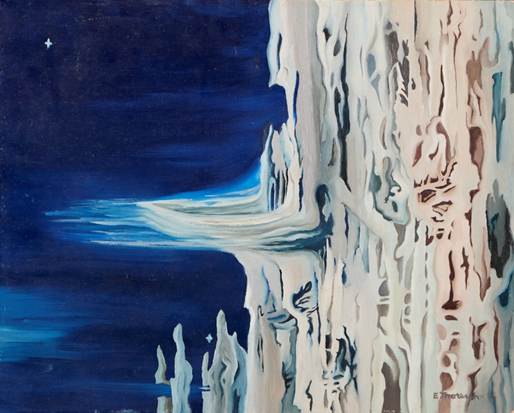 Thoresen and Bjerke-Petersen traveled to Paris in 1937 and met Max Ernst, Yves Tanguy, Kurt Seligmann, Jean Arp, Sophie Taeuber-Arp, Marcel Duchamp, André Breton and Kandinsky, according to a 1976 interview. In 1938, they exhibited in L’Exposition Internationale du Surréalisme, curated by Breton and Paul Éluard, and she was one of only a few women to be included. She showed The Light of the World – the Light of Darkness (1937), another image of a candle, and I Do Not Know (1937).