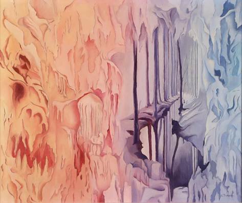 The driftwood-inspired painting that is untitled plays with perspective, drawing us in toward what I see as a forest. The colors are soft corals, purples and blues. The Mountain at Night raises different questions: What lies beyond the deep blue indigo space? The title is curious, and it makes me think of a fjord cliff-side with its weathered striations similar to the surface of driftwood, perhaps one Thoresen once saw.