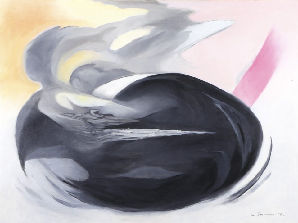 I am drawn to a painting of a large egg-shaped form (Untitled, 1975), painted predominantly in black and white and shades of gray. The outer egg encloses a tiny, pink egg shape. It evokes a feeling of protection, and it makes sense that themes of motherhood might appear. Her paintings feel soft; the edges never harsh, unlike Bjerke-Petersen’s. She seems to deliberately blend the color transitions, giving her forms a voluminous quality. Ribbon-like shapes, reminiscent of arms, appear to hold and shelter the inner form.