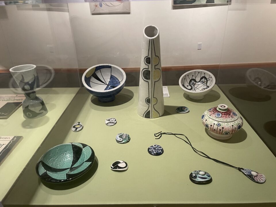 The final gallery presents a selection of Bjerke-Petersen’s paintings, marking his first showing in the U.S.. In a glass case, some of his ceramics for Rörstrand Pottery are on display with a small ceramic-lidded jar he made for his daughter Alice, which was intended to hold the ceramic jewelry he created for her. Also, some of his books and magazines are also on display, including Surrealismen (1934).