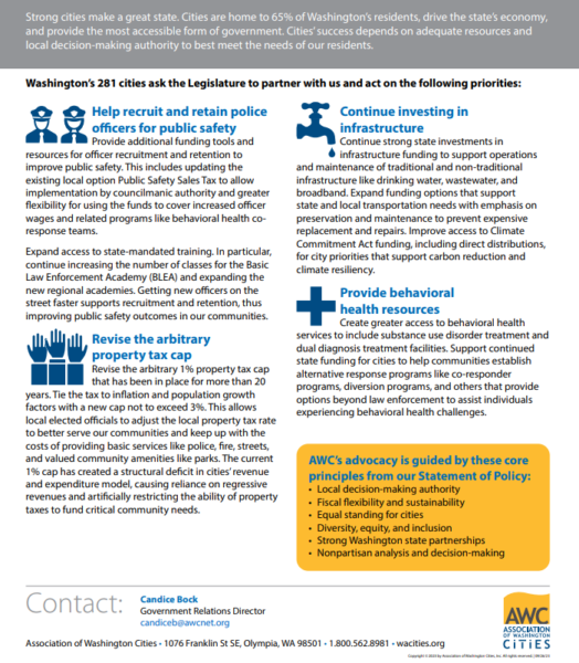 Councilmember Patrick Decker questioned an AWC priority entitled “Revise the arbitrary property tax cap,” which would revise the current 1% property tax to adjust for inflation and population growth with a new cap not to exceed 3%. Decker said he would be opposed to such an option as property owners were already paying high taxes.