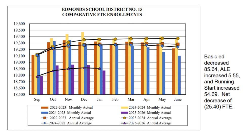 For enrollment, Sellie said the District saw a decrease of about 85 basic education students from December 2025 through January 2026, but the increase of 55 Running Start students and 5.5 ALE students results the net decrease of about 25 students.