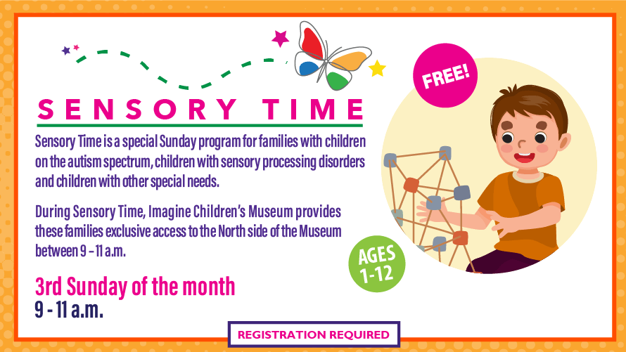 Sensory Time is a special Sunday program for families with children on the autism spectrum, children with sensory processing disorders and children with other special needs. During Sensory Time, Imagine Children’s Museum provides these families exclusive access to the North side of the Museum between 9 – 11 a.m.