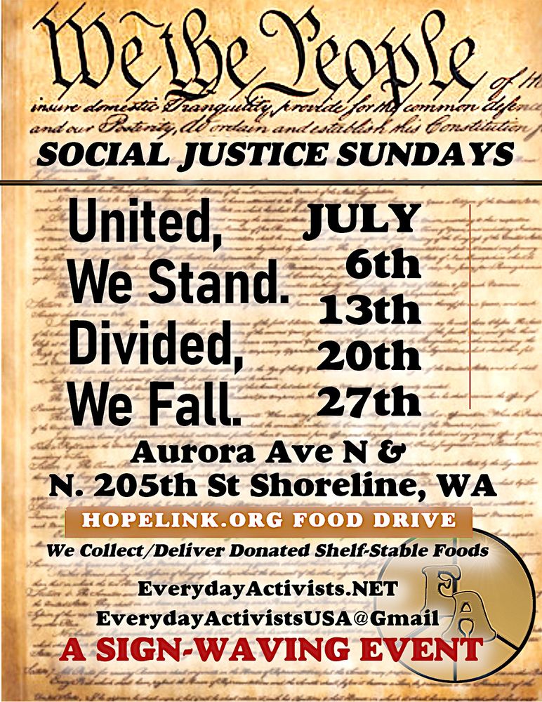 “Social Justice Sundays” sign-waving events organized by Shoreline-based Everyday Activists continue at the intersection of Aurora Avenue North and N. 205th St. (the Shoreline-Edmonds line), every Sunday in July, 1-2 p.m. The events this month have the theme, “United, we stand. Divided, we fall.”