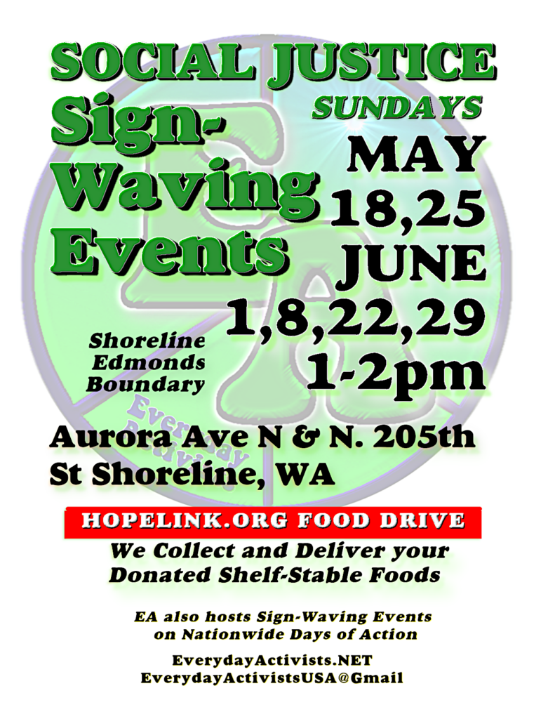 Local group Everyday Activists is hosting another two “Social Justice Sundays” sign-waving events this month, May 18 and 25, 1-2 p.m. at the intersection of Aurora Ave. North and N. 205th St., at the Shoreline/Edmonds line to protest the Trump administration abdication of the principles of social justice – working towards fairness, equity and equality for all, while not shying away from acknowledging historial and systemic factors in social injustice.