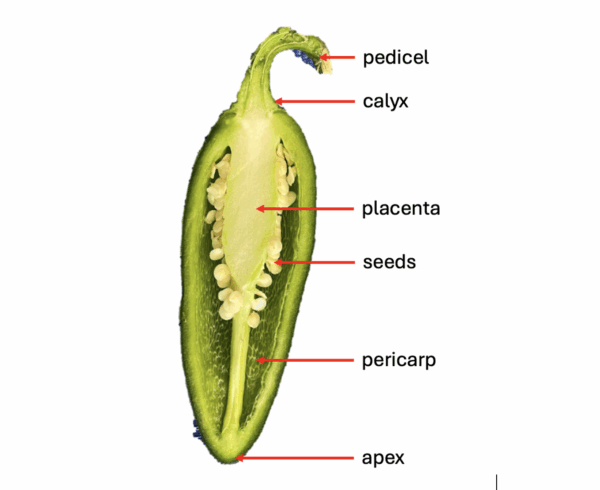 If you want to eat hot peppers for the flavor instead of the burn, you can remove the seeds and placental tissue that they are attached to. This is what a capsaicin-weeny like me does when I make jalapeno poppers. I scrape out the “guts” of the pepper pod –- the placenta and seeds — and just eat the milder fleshy fruit wall (accented nicely with melted cheese and bacon).