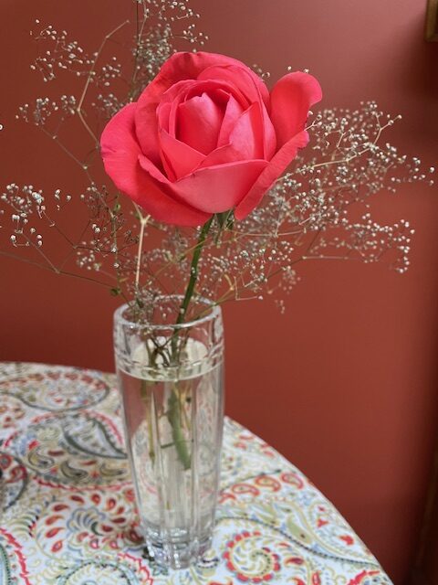 The deer would jump the fence and munch on her row of roses. Sometimes she covered the plants with wire. She bought us a favorite rose for a wedding present called Fragrant Cloud — a beautiful hybrid tea rose with a lovely scent (pictured below). Smelling this rose when she visited triggered fond memories for her and brought her joy.