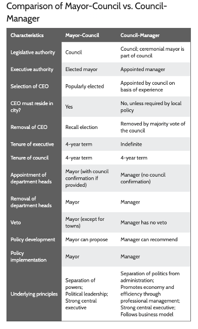 I would like an article on the different models of city governments and their pro and cons. We have local examples to draw upon and their successes and flaws. For example: mayor vs city manager vs ? Thank you.