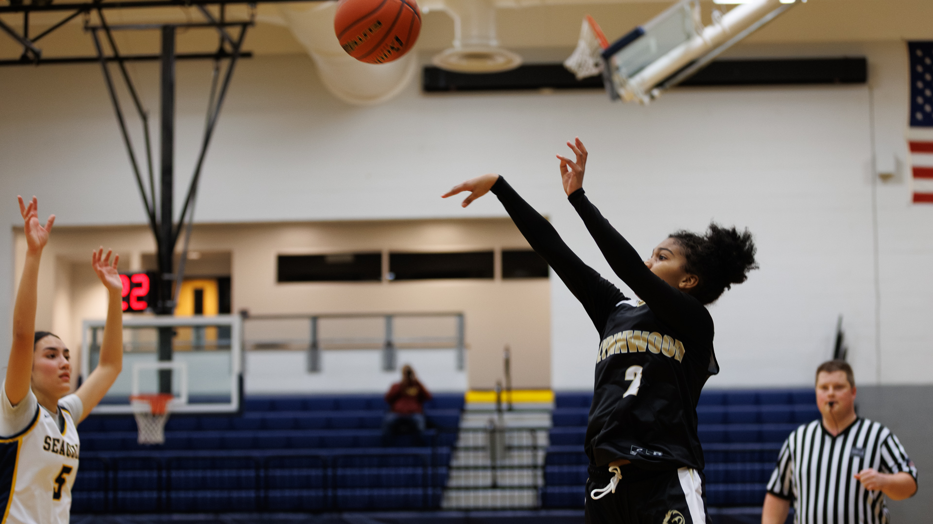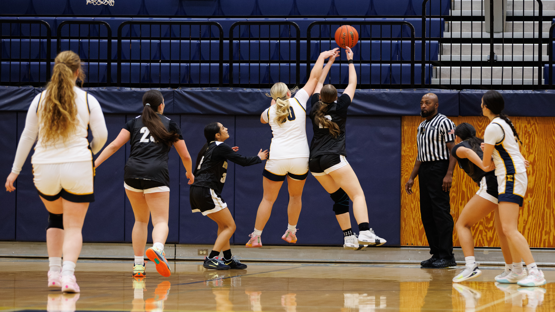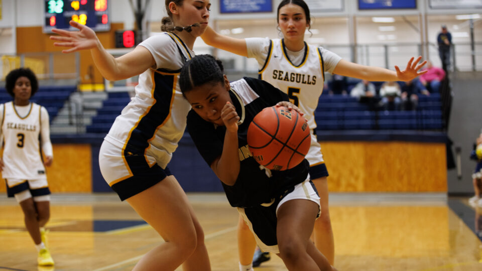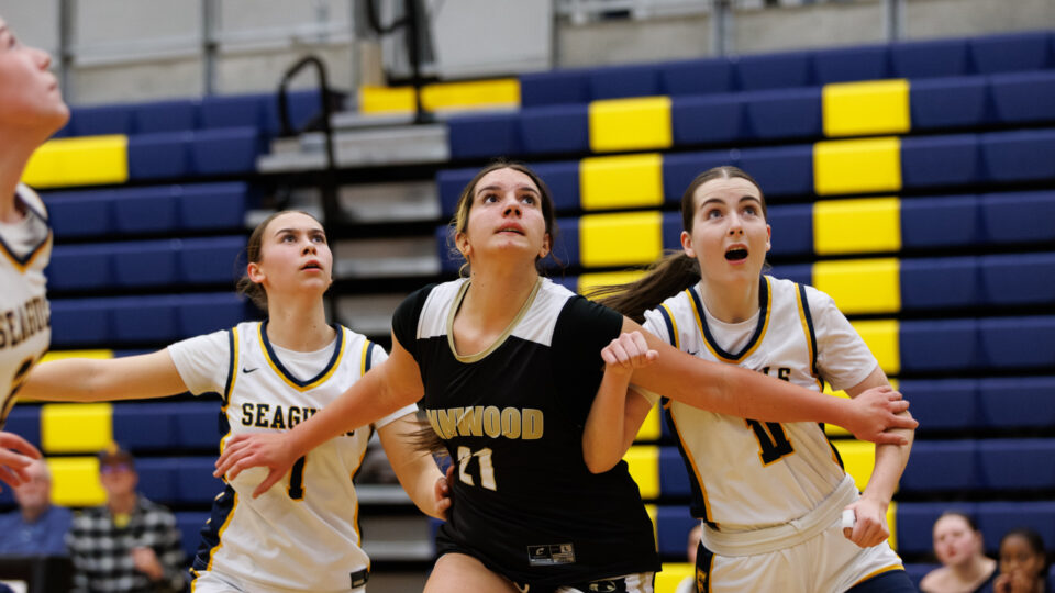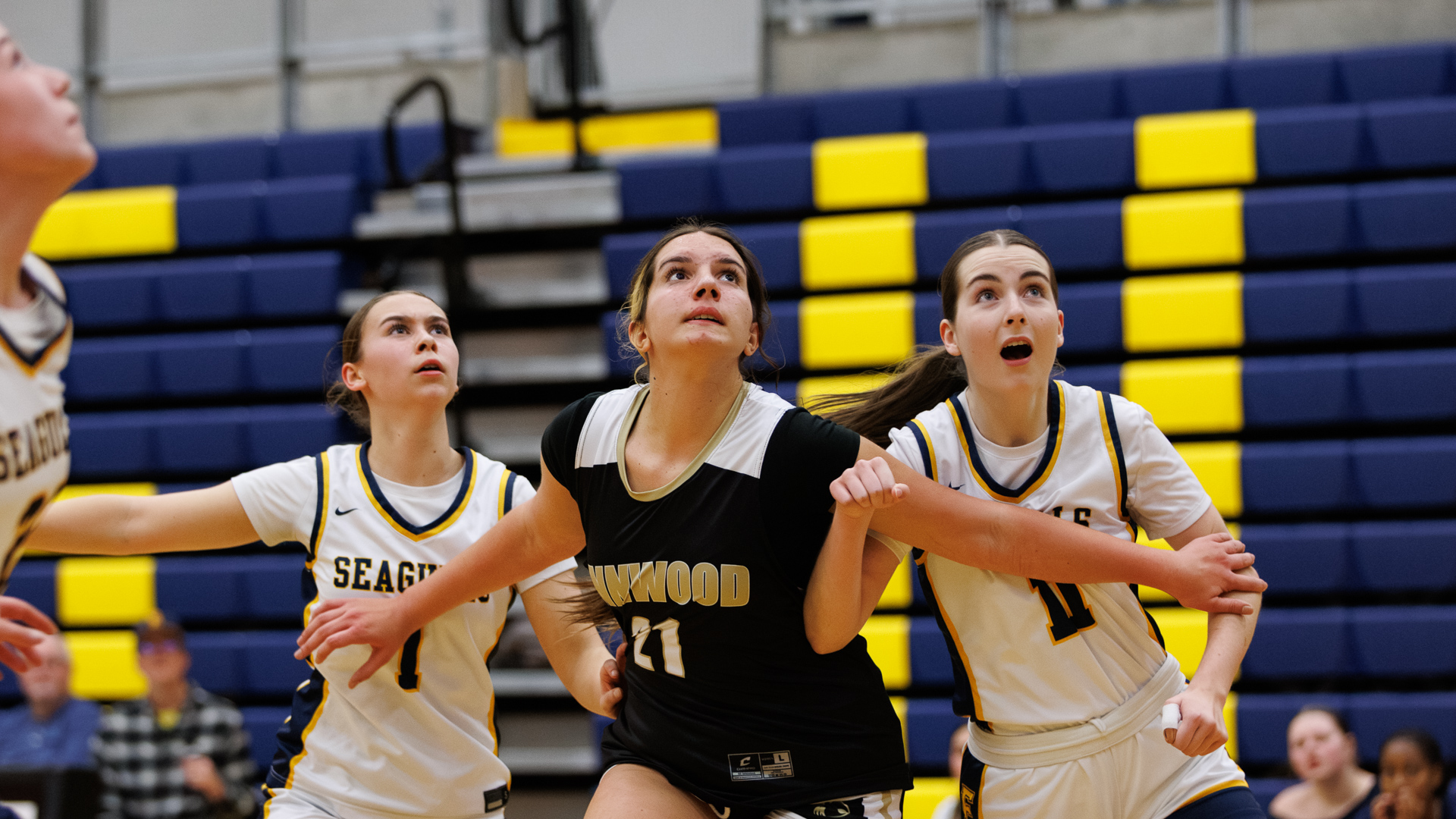 Lynnwood sophomore Genevieve Andreica (21) boxes out two Seagulls during a Lynnwood free throw attempt.