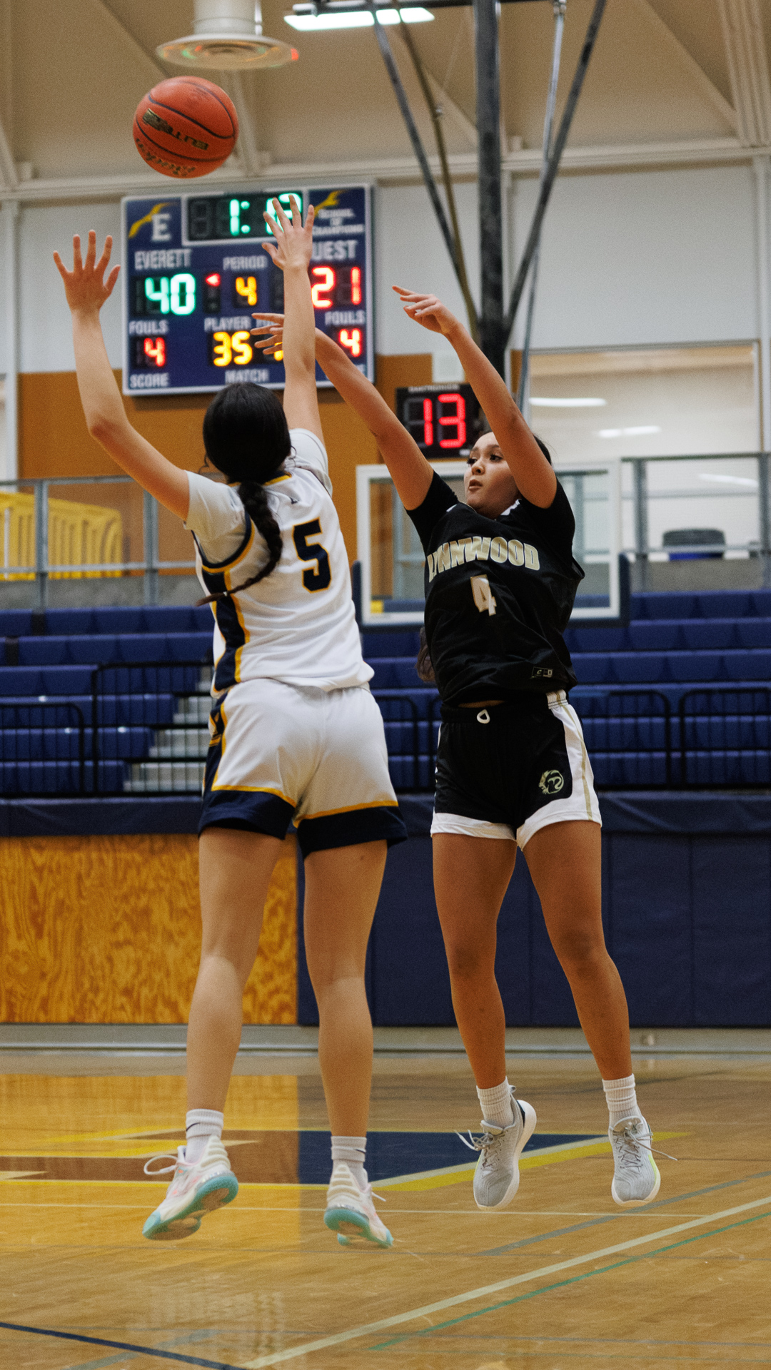 Lynnwood senior Vanessa Olivar (4) launches a 3-pointer over an Everett defender.