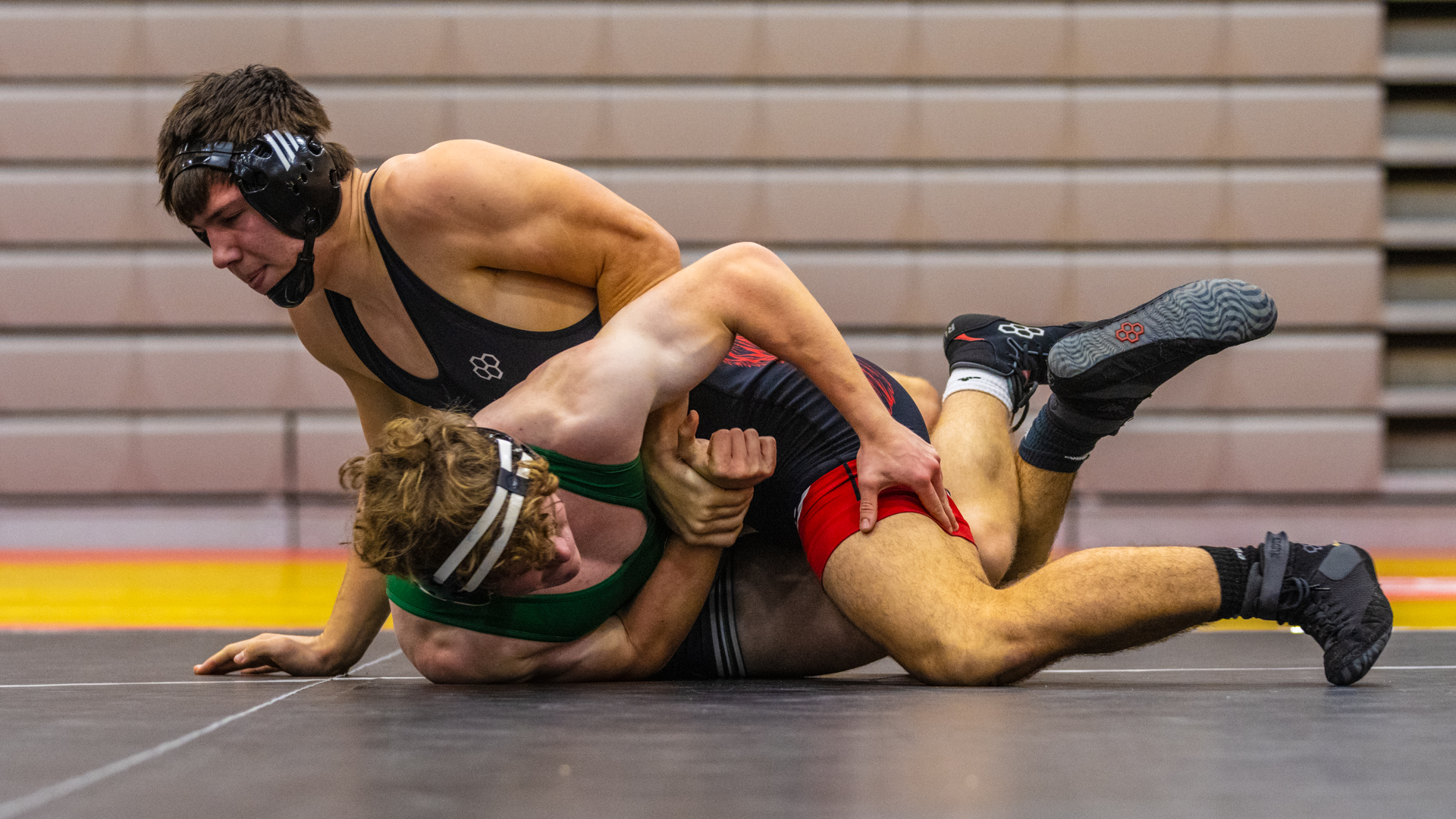Mountlake Terrace junior Titus Swett is locked up in a match against Oak Harbor Dec. 9 at Lynnwood High School. (Photos by David Cardwell)