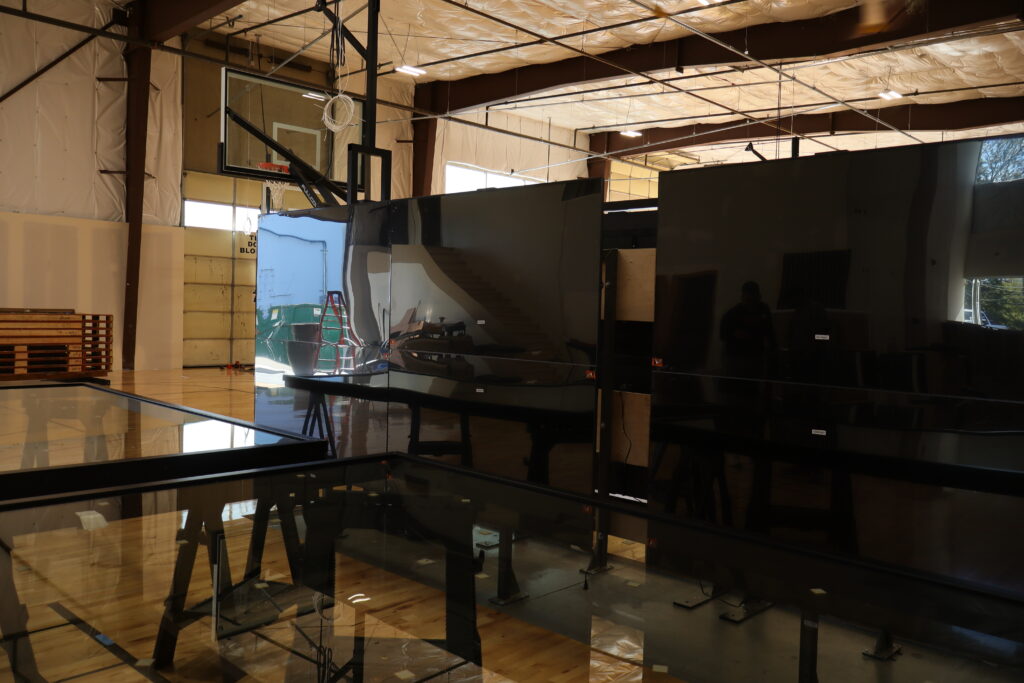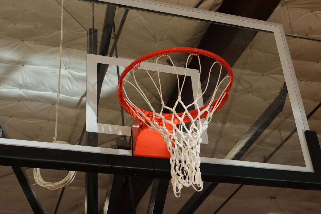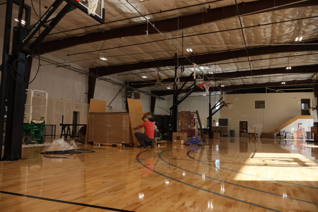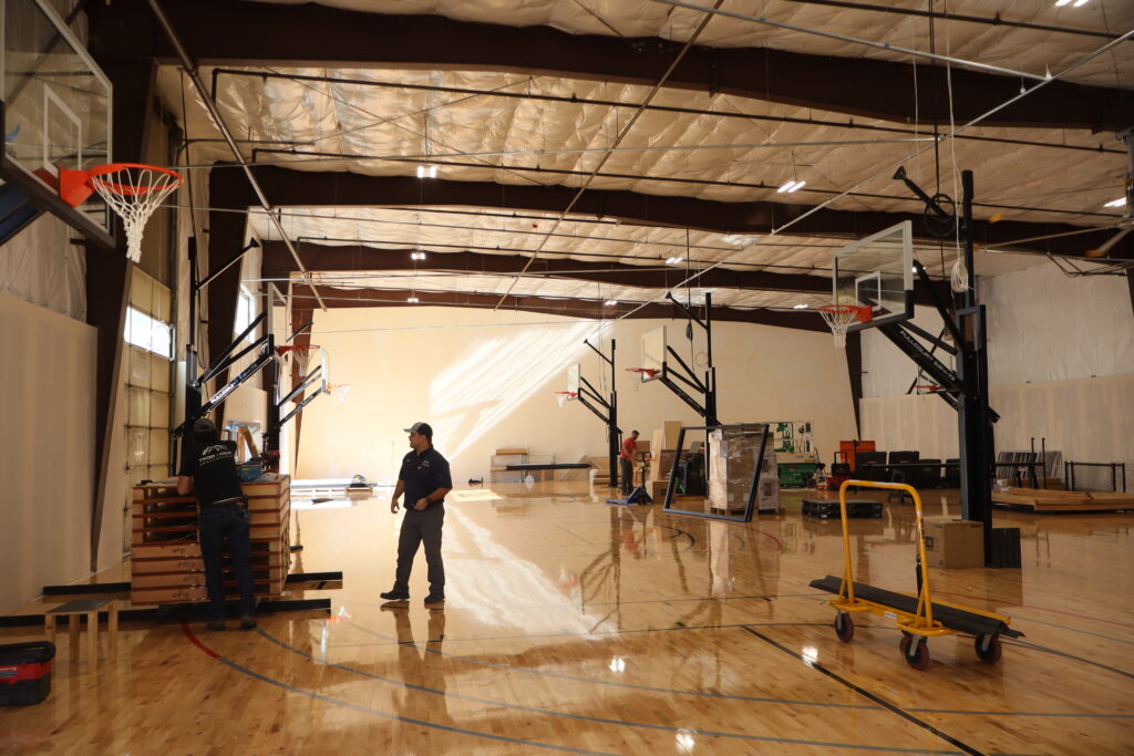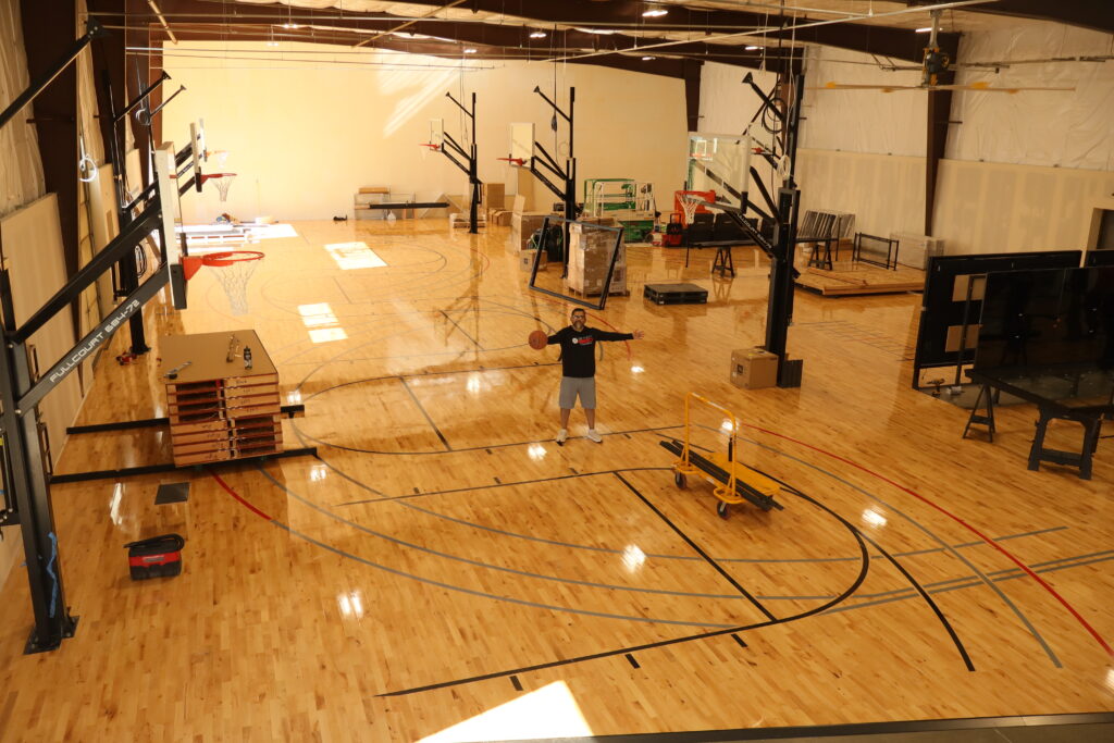 Standing near one of the basketball hoops, Majeed pointed to a black, metal bar that stuck out over the hoop. “It’s going to have a TV screen attached to it and a camera that goes on top of that,” he said. “Those are motion-sensing cameras, made with NOAA Noah [Basketball] technology…that tells three things about their shots: Left or right, how narrow or deep their shots are, and the optimal arc. So for every single shot, it’s measuring those three things against what the optimal parameters are. And it’s giving you instant feedback on every shot on the screen.”