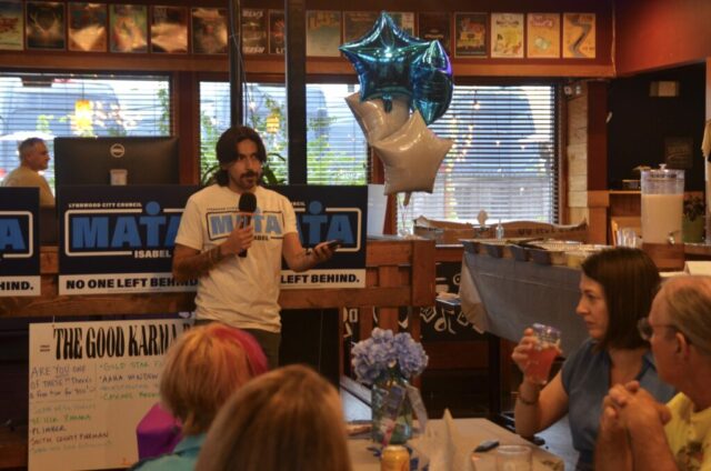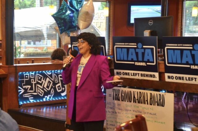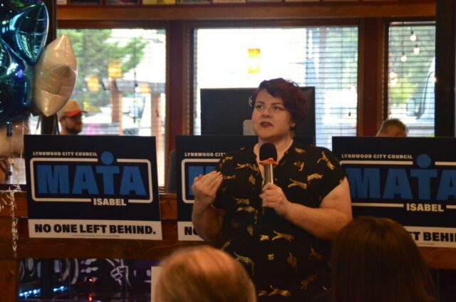 In addition to her campaigning, Mata has attended recent city council meetings, where she’s brought certain issues to the council’s attention during public comment. These have included a lack of parking at the Lynnwood Transit Center during peak business hours, and asking the council to support local nonprofit Lynnwood Pride when the city denied the group’s request to hang a Pride flag in a city park in June.