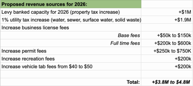 Beyond tax and fee increases, the Council has been exploring additional revenue options for months. Ideas include a public safety sales tax to reduce police department expenses from the general fund and potential increases to vehicle tabs, business license fees and head taxes.
