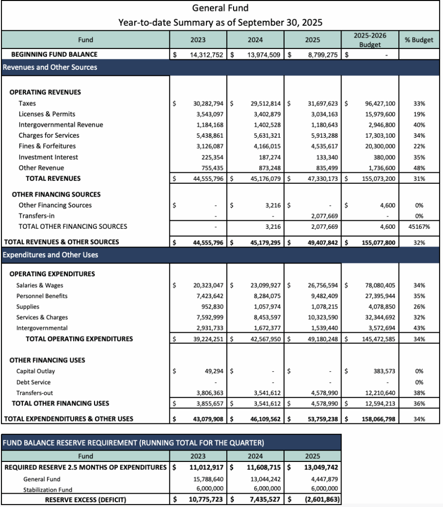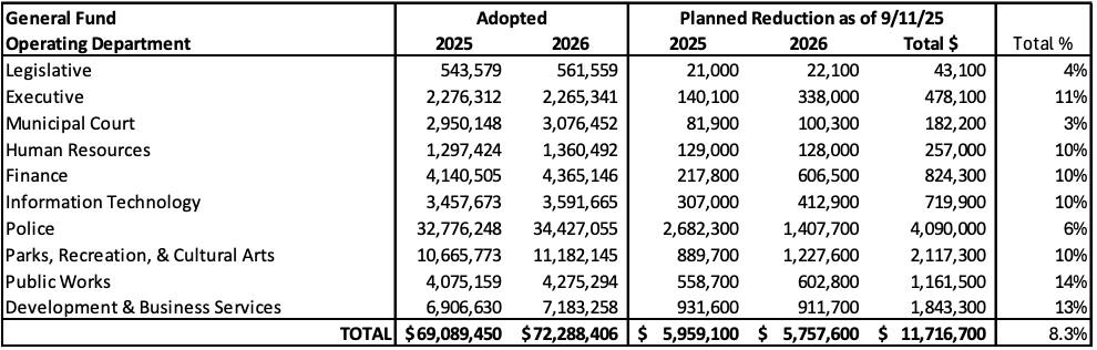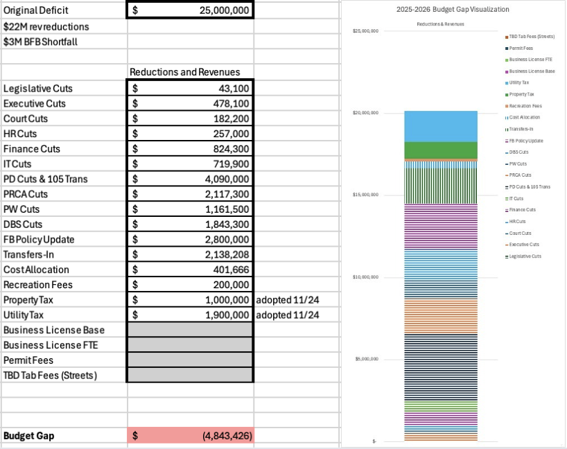 But by early 2025, revenues had stalled. First-quarter reports showed zero growth over 2024, leaving Lynnwood on track for a $25 million deficit by the end of 2026 if no action was taken. Mayor Frizzell ordered $12.3 million in cuts, eliminating the equivalent of nine full-time positions across departments, including the City’s equity and social justice advisor and more than $4 million from police through freezes and vacancies.