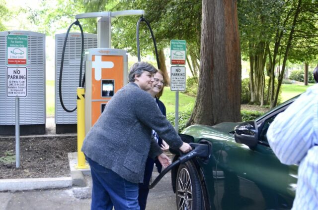 “I am so excited that we now offer EV charging at our civic campus,” Mayor Christine Frizzell said at the ceremony Monday. “Our community members can now charge up while taking a fitness class at the rec center, checking out a book or two at the Lynnwood Library or while taking a stroll along our beautiful Mesika Trail. Thank you to the incredible staff who were instrumental in making this project a reality.”