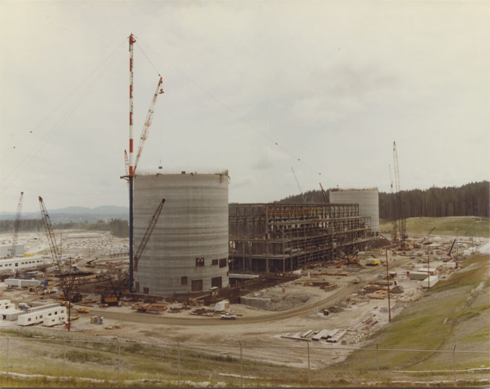 Construction at the Satsop Nuclear Power Plant took place in the late 1970s and early 1980s, as seen here. But the Washington Public Power Supply System project was never completed. The nuclear power technology companies are pressing ahead with today is much different than the fission reactors of decades past. (Photo courtesy Washington State Historical Society)