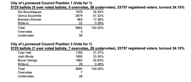 Incumbent Derica Escamilla secured the primary vote for Lynnwood City Council Position 1, according to official results posted Tuesday at 5 p.m. In Position 3, political newcomer Bryce Owings narrowly outpaced incumbent Josh Binda by 87 votes.