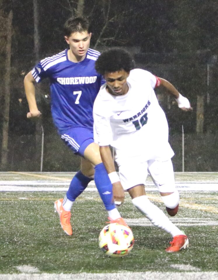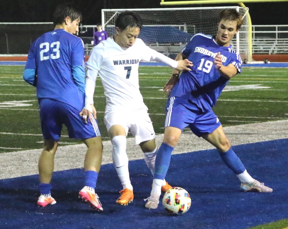 The Warriors best scoring chance — and only shot on goal in the game — came in the 13th minute with a Natan Ghebreamlak penalty kick. But the senior’s PK was turned away by Shorecrest starting goalkeeper Kaare Nye.