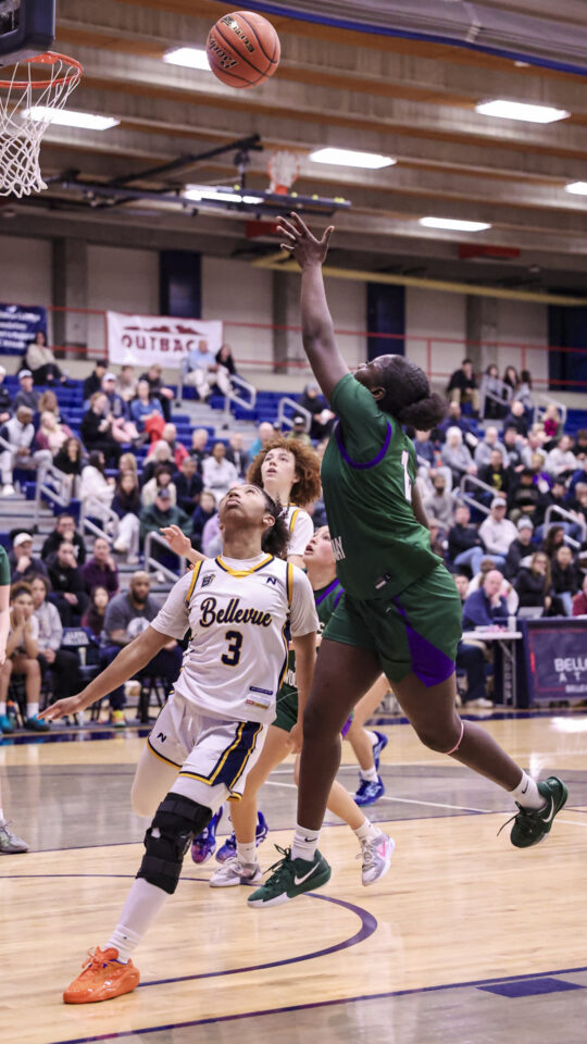 E-W stayed close, down 15-14 after another Wichers’ triple at the 6:44 mark of the second quarter. But Bellevue was able to stretch out its lead to 29-18 at halftime, helped by scoring five points in the final 7.3 seconds of the first half on a Nayvi Robinson hoop and a Iyla Jones 3-pointer at the buzzer.