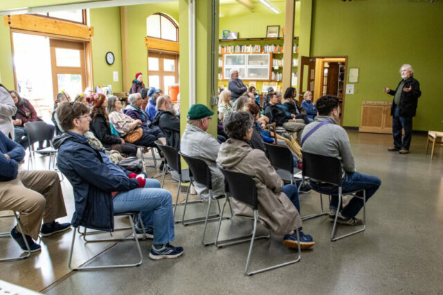 Visitors listen to gardening experts.