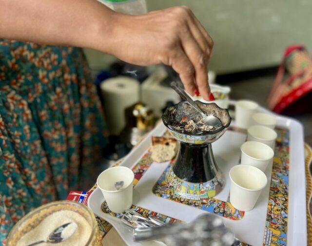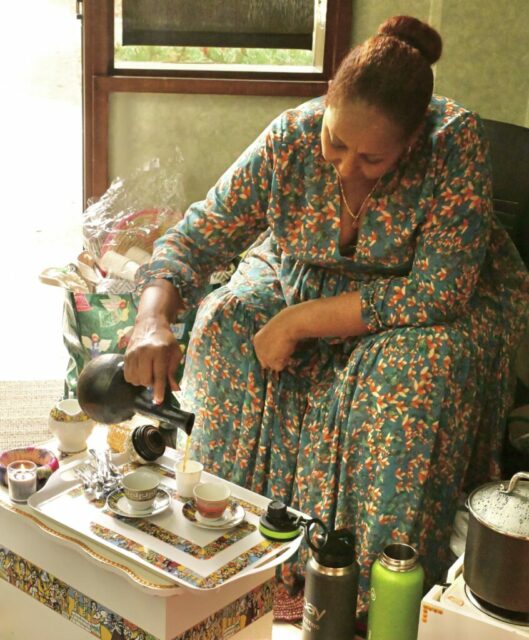 The Ethiopian Coffee Ceremony generally lasts about three hours and is central to Ethiopian community life, often performed for guests, during gatherings or to mark significant life events. During the ceremony, green coffee beans are roasted, ground, brewed and served — typically in three rounds.