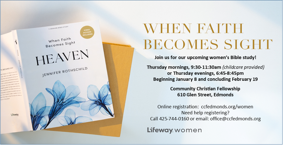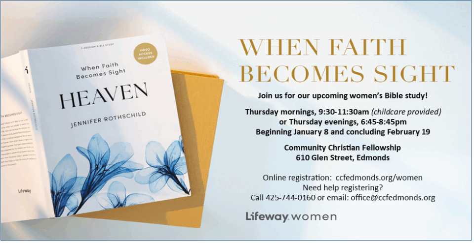 Community Christian Fellowship will host a weekly women’s bible study to explore the subject of Heaven each Thursday morning or Thursday evening, beginning Jan. 8. Women from the community are invited to attend as we walk through this seven-session, video-based study, where author Jennifer Rothschild explores the subject from a biblical perspective. She will separate what’s true about Heaven from what’s based on legend, media depictions and hopeful guesses.