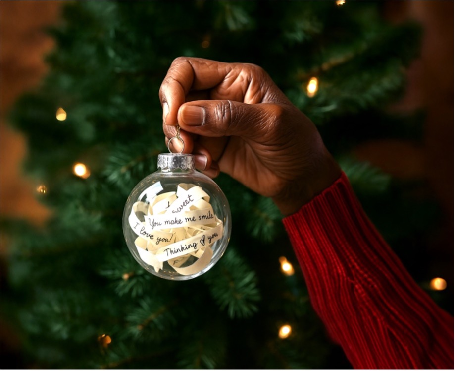 Write a few words or a short message — something that captures the feeling (“Grateful,” “Family dinners,” “Our first home”). Roll or fold it gently to fit inside the ornament.