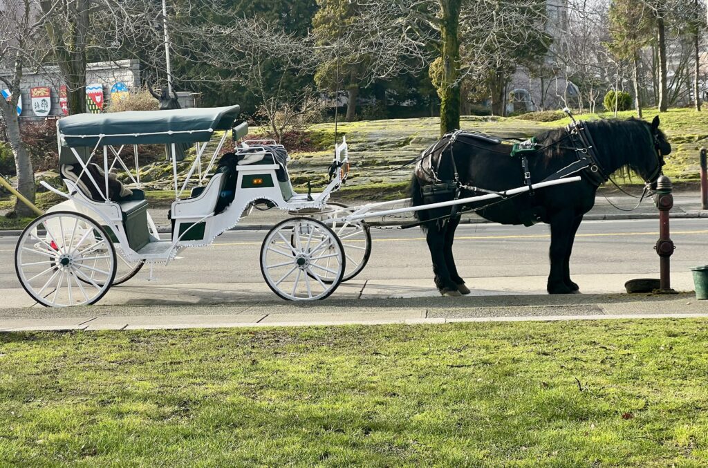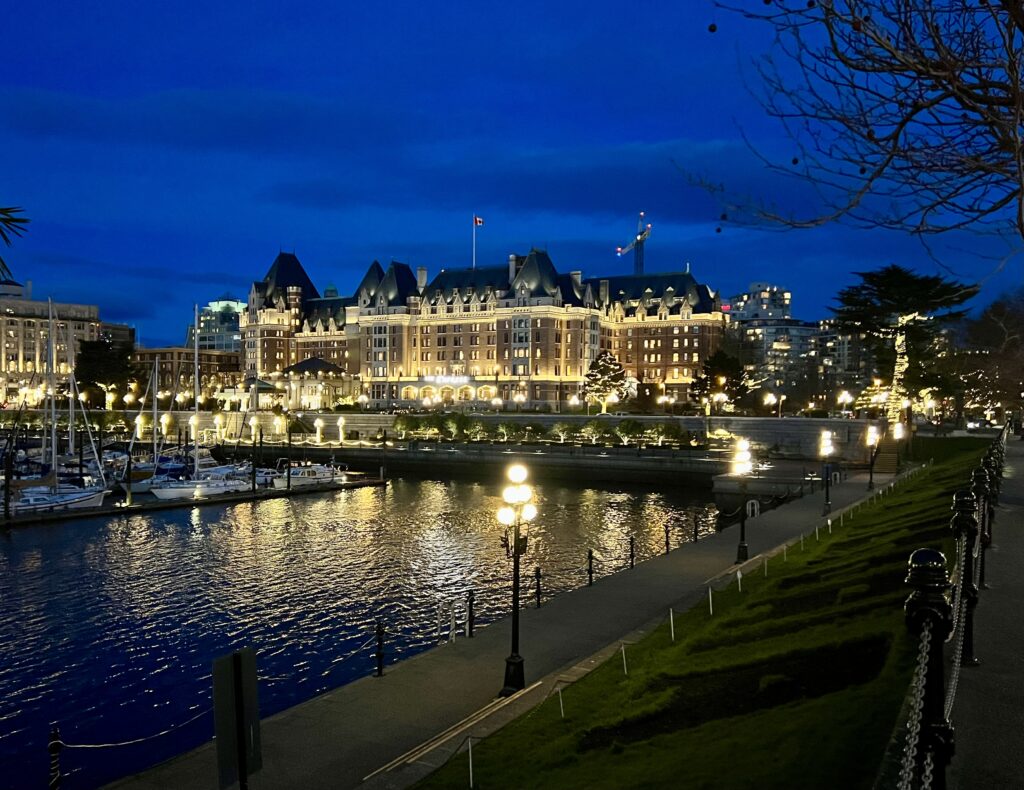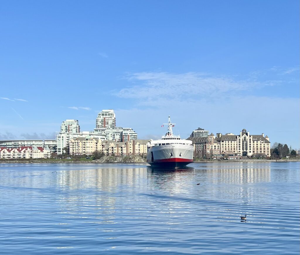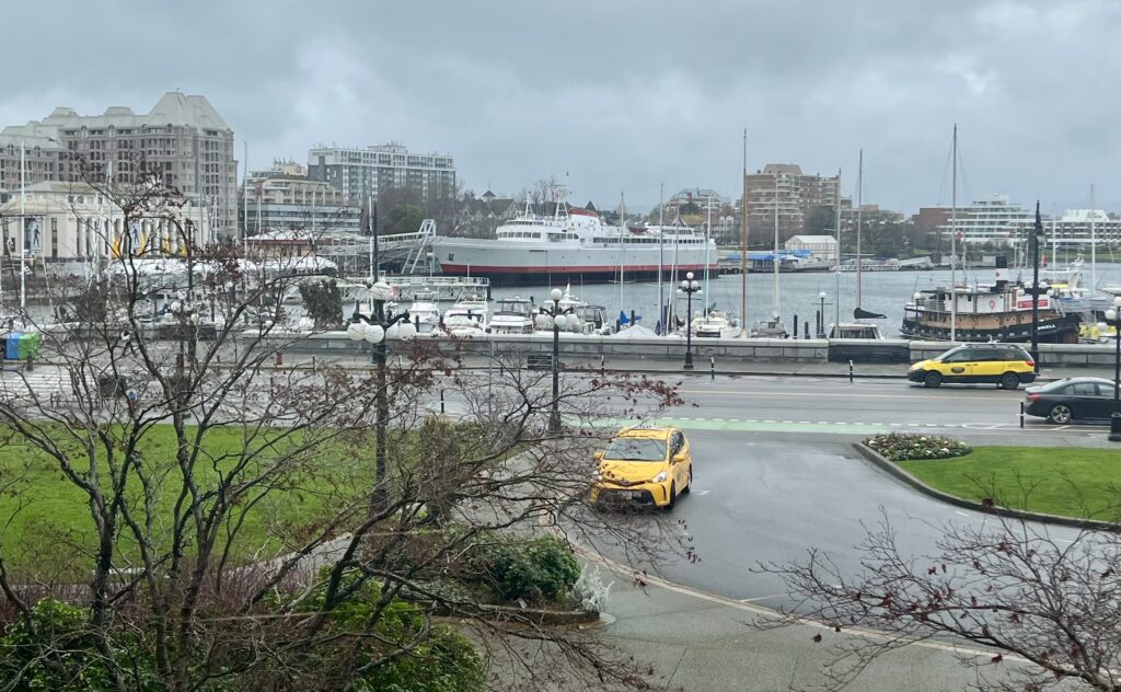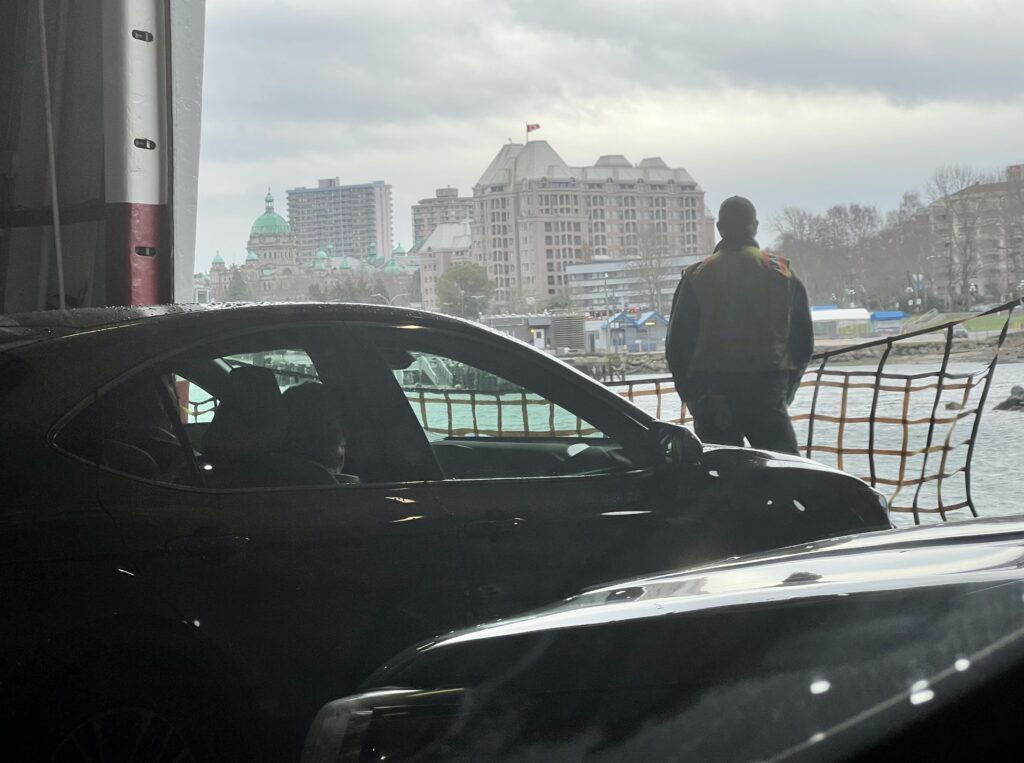 So it wasn’t Victoria as a destination that was on my bucket list, but the desire to experience a more novel means of getting there, namely the MS Coho Blackball ferry from Port Angeles. It’s possible to leave your car there and walk on to board, but we chose to pay for a round-trip vehicle reservation, even though we left our vehicle parked at our Inner Harbor-sited hotel for our entire stay. It is remarkable that our local land/water topography results in the surprising recognition that a two-hour ferry and drive trip to Port Angeles, and a 90-minute voyage onward, ended up placing us just 63 miles from Edmonds. That distance was enough, however, despite some wave chop crossing the Strait, to dodge the windy atmospheric “river” storm that was tormenting our home town. Over our two-day stay, it was chilly and breezy, but mostly dry and even sunny for our walking about a mile (2K?) each way along the harbor and up through the shops on Government Street.