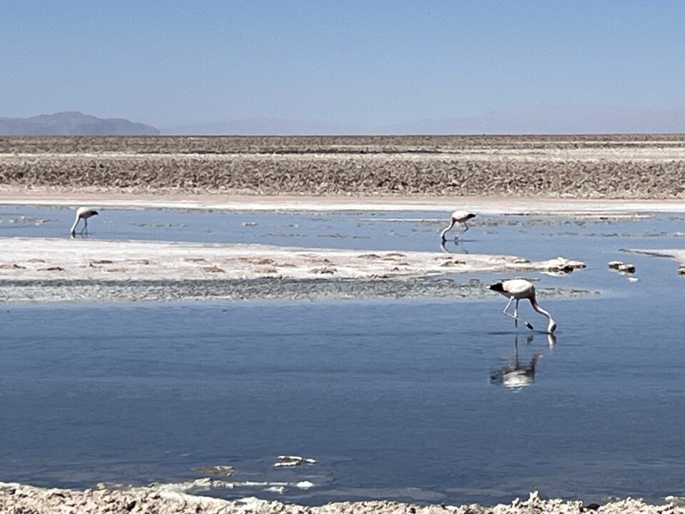 Another extreme terrain is the Salar de Atacama, Chile’s largest salt flat. It encompasses about 1,178 square miles, including desert lagoons, salt crusts and Los Flamencos National Reserve. At the Chaxa Lagoon, we watched Chilean and Andean flamingos feeding and occasionally flying past. A third, less-common species there is the James flamingo.
