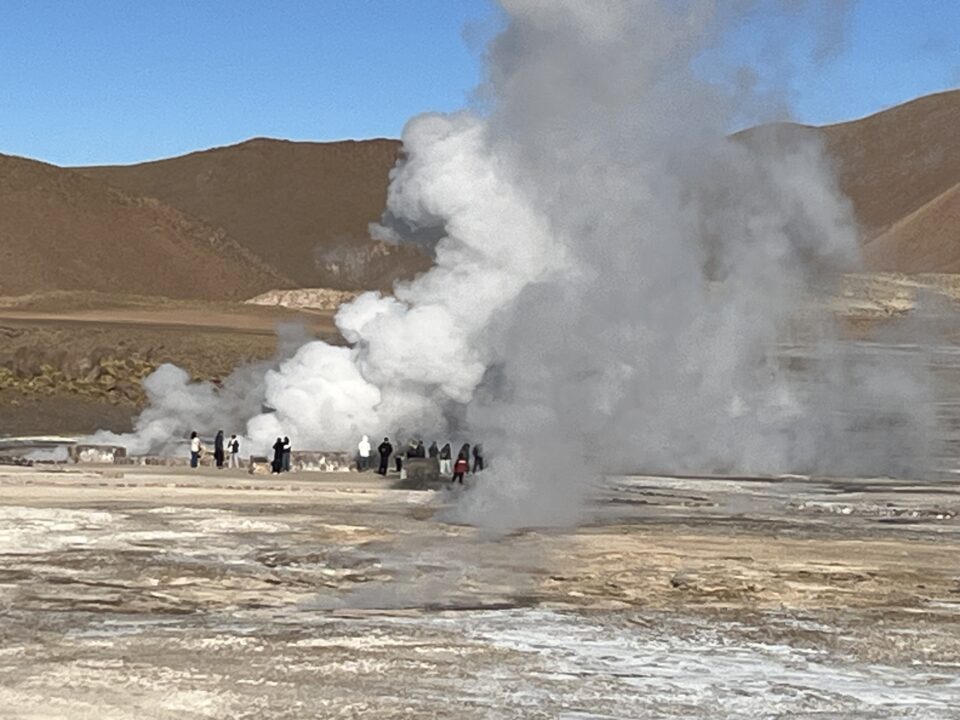 We set off just before dawn to see the El Tatio Geyser Field, which produces its most spectacular eruptions in the early morning desert air. It is the third-largest geyser field in the world, after Yellowstone in the U.S. and Dolina Geyserov in Russia. Here roughly 80 geysers alternately bubble, erupt and explode skyward. The high altitude causes water to boil at a lower temperature, so the eruptions are most impressive in the cold morning air.