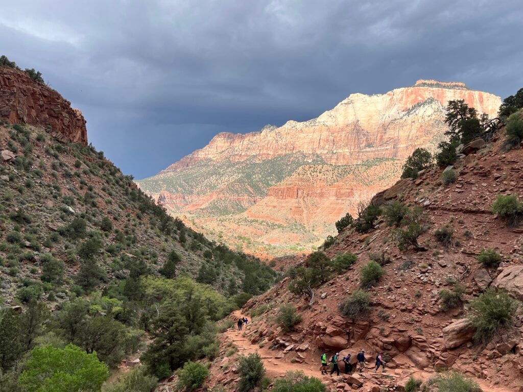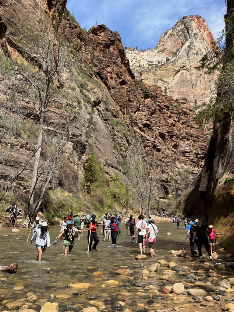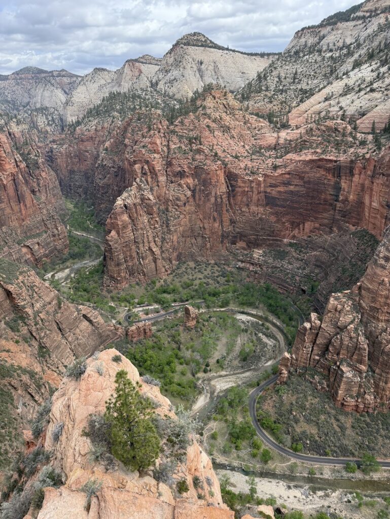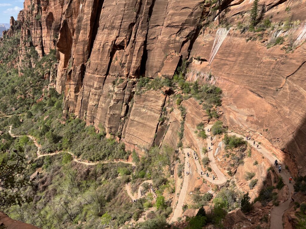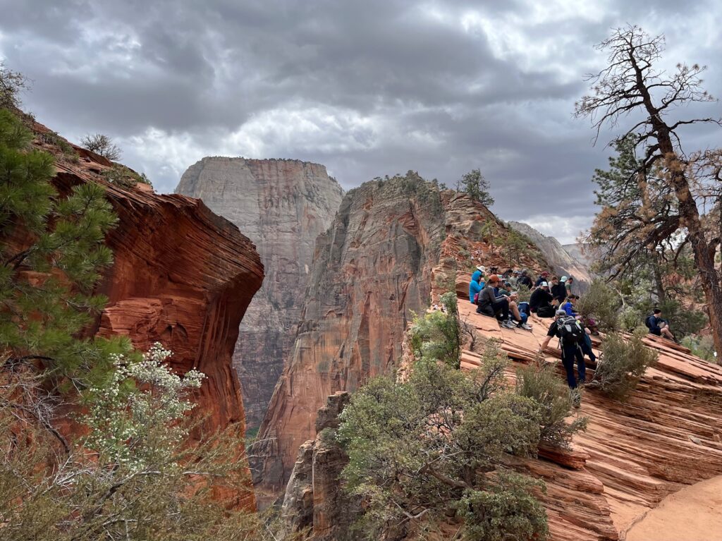 The next day we hiked up Walter’s Wiggles to Scout’s Lookout (elevation gain: 1,100 feet) for an incredible view of Zion’s colorful sandstone cliffs rising above the Virgin River. Scout’s Lookout is where those who have obtained permits can then climb Angel’s Landing, the most challenging of Zion’s hikes. Later we also hiked to Emerald Pools and underneath a waterfall.
