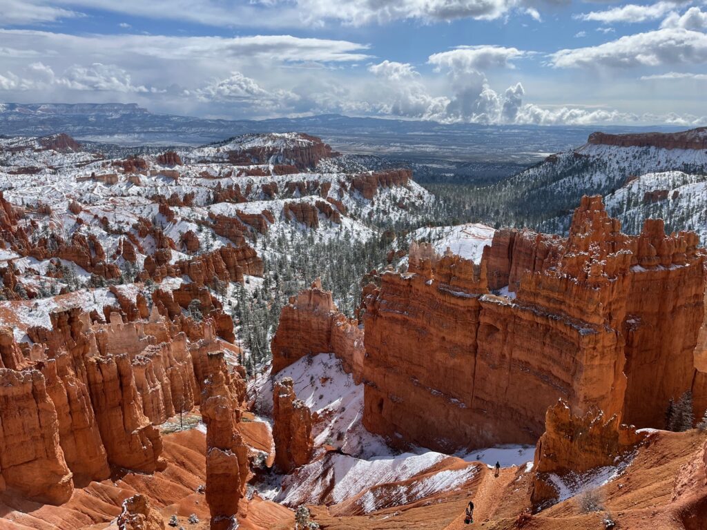 Zion is more popular and accessible than Bryce, attracting about five million visitors annually compared to Bryce’s 2.4 million. Because Zion sits at lower elevations than Bryce, its climate is milder in winter and hotter in summer. In mid-April, we enjoyed warm, sunny weather in Zion – and below-freezing temperatures plus snow one day in Bryce. Due to its high elevation, the weather at Bryce can be highly variable for much of the year.