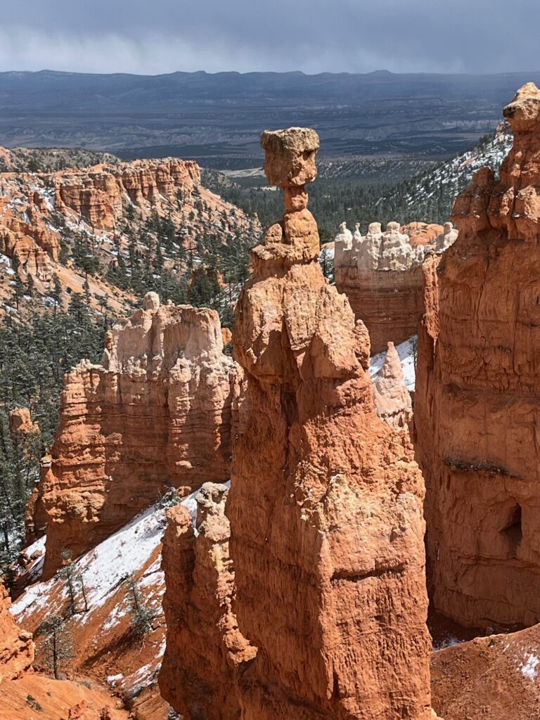 We hiked the rim trail south to north, starting at Bryce Point on our first day there. A coating of fresh snow below the rim surprised us, as did sudden sunny skies during our hike. The striking red, orange, and white rock walls and hoodoos were illuminated one moment, shaded by clouds the next. As we completed our rim hike, a snow/hail storm suddenly closed in, and we quickly retreated to the Visitor Center. Lesson: be prepared for any weather at Bryce.