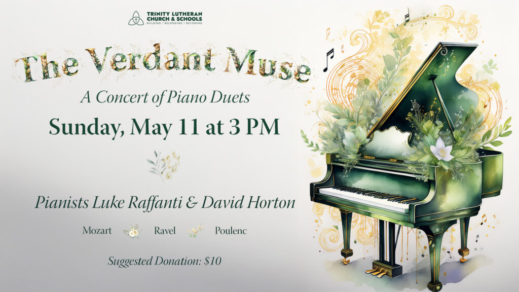Trinity Lutheran Church Lynnwood 6215 196th Street SW, Lynnwood, WA, United StatesPianists Luke Raffanti and David Horton create a vibrant soundscape in "The Verdant Muse," a piano duet concert celebrating the season of renewal. From the classical elegance of Mozart to the whimsical charm of Ravel's Mother Goose Suite and the bombastic energy of Poulenc, this program offers a delightful journey for the ears. Suggested Donation: […]